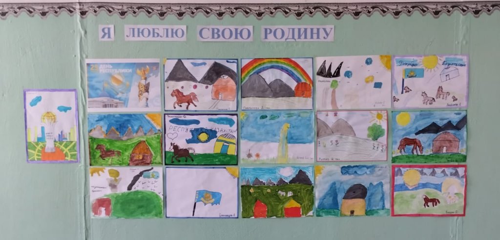 "Мен өз Отанымды жақсы көремін" сурет көрмесіне бастауыш сынып оқушылары қатысты. Бұл көрме Қазақстан Республикасы күніне арналған. Балалар өз суреттерінде туған өлкеге деген шексіз сүйіспеншілікті көрсетті.